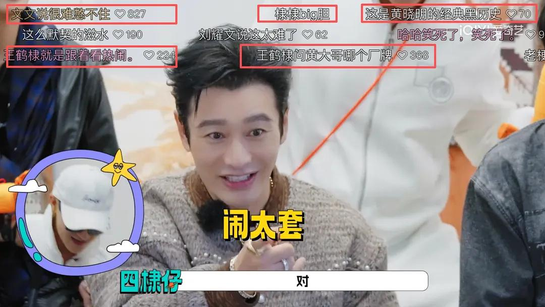 大哥黄晓明名场面不断:知道时代少年团但记不得完整的成员名字,看到邵子恒送的老鼠干第一反应是“这是扎小人用的吗”;作为宇宙爆闪团第一游戏黑洞,跳舞环节被大家“赶”去舞厅跳迪斯科,伪装大师游戏结束都没搞懂规则,在“猪羊闹”中黄晓明更是羊猪不分,被王鹤棣、黄子韬俩弟弟疯狂调侃“你是哪个厂牌的”、“闹太套”。