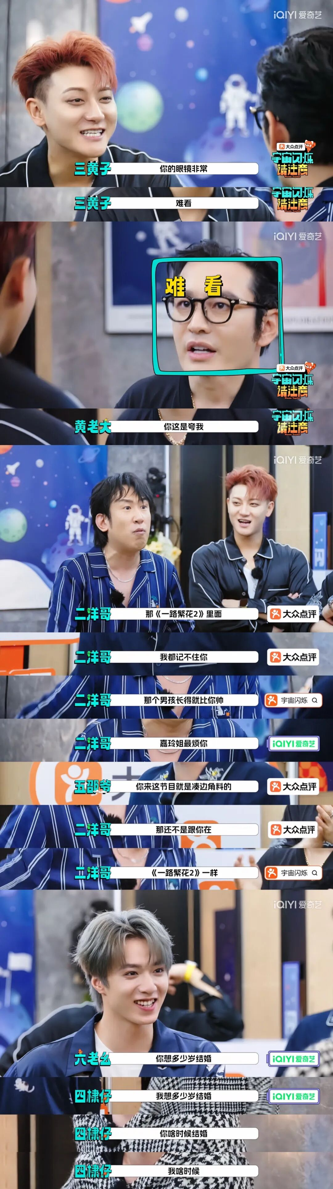 这些在《宇宙闪烁请注意》里已经是基操了。不靠剧本设计、不靠任务强加的化学反应,宇宙爆闪团这六个人凑在一起,站着就能把事儿变成段子。