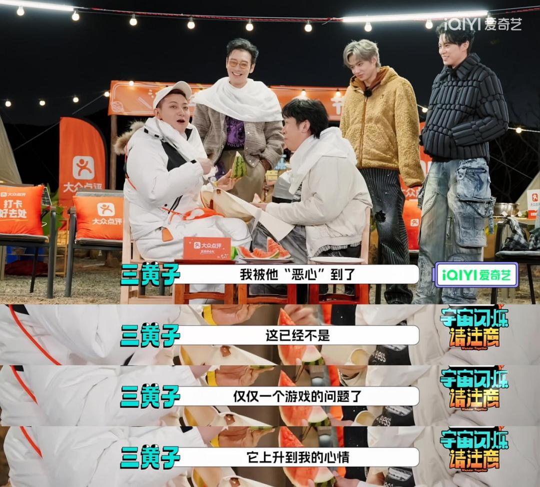闻头发猜人环节,愣是被宇宙爆闪团爆改成了猜弹脑瓜崩,六个人既不尊老也不爱幼,眼里只有对攻击的渴望,主打一个弹完你的弹你的;严肃吃瓜大赛与严肃毫不沾边,歪嘴战神大战斗鸡眼,看于洋顶着一张长脸狂喷西瓜汁的黄子韬根本憋不住,直呼“这已经不是一个游戏的问题,它上升到影响我的心情!”