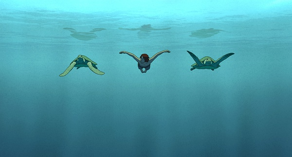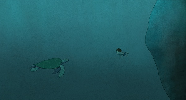 在最后一次出海中,他最终遭遇了屡次撞沉自己的怪兽,一只巨大的红海龟,他们四目相视,他一开始非常害怕这个庞然大物,接着由愤怒激起的勇气令他尝试着反击。看到此时突然想到老人与海,也想到少年派,大海龟不断挑战着求生男人的决心,同时也是他每次出海唯一的同伴。奇妙的是,红海龟确实是以另一种形式在电影中陪伴了困在荒岛的男主人公,他们的第一次相遇也许是海龟对人类好奇的驱使引致,然而他们的和解却是男人心中对生命的敬畏来推动。而当脱胎换骨后,则是反过来的另一次轮回。
