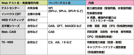 n公司出题的web test可以在家完成,数学题部分因为要在短时间内做完大量计算,一些学生会请朋友帮忙、或者干脆找数学好的朋友代考。n《何者》里也有提到,就职期间的web test是大学生们检验彼此友谊的一种方式;二阶堂富美演出的角色因为数学不好而屡屡在web test中惨败,佐藤健和菅田将暉便猜测她没什么朋友。nn除了公司出题的形式以外,更多的公司则是接受Test Center的考试成绩。Test Center的成绩虽然可以在两年内反复使用,但由于分数不公布给学生,而由网站直接发送给企业,所以有一定的风险因素。要参加这种考试需要网上预约日程和考场(以关东为例,考场都在东京),届时到指定会场参加统一测试(机考)。