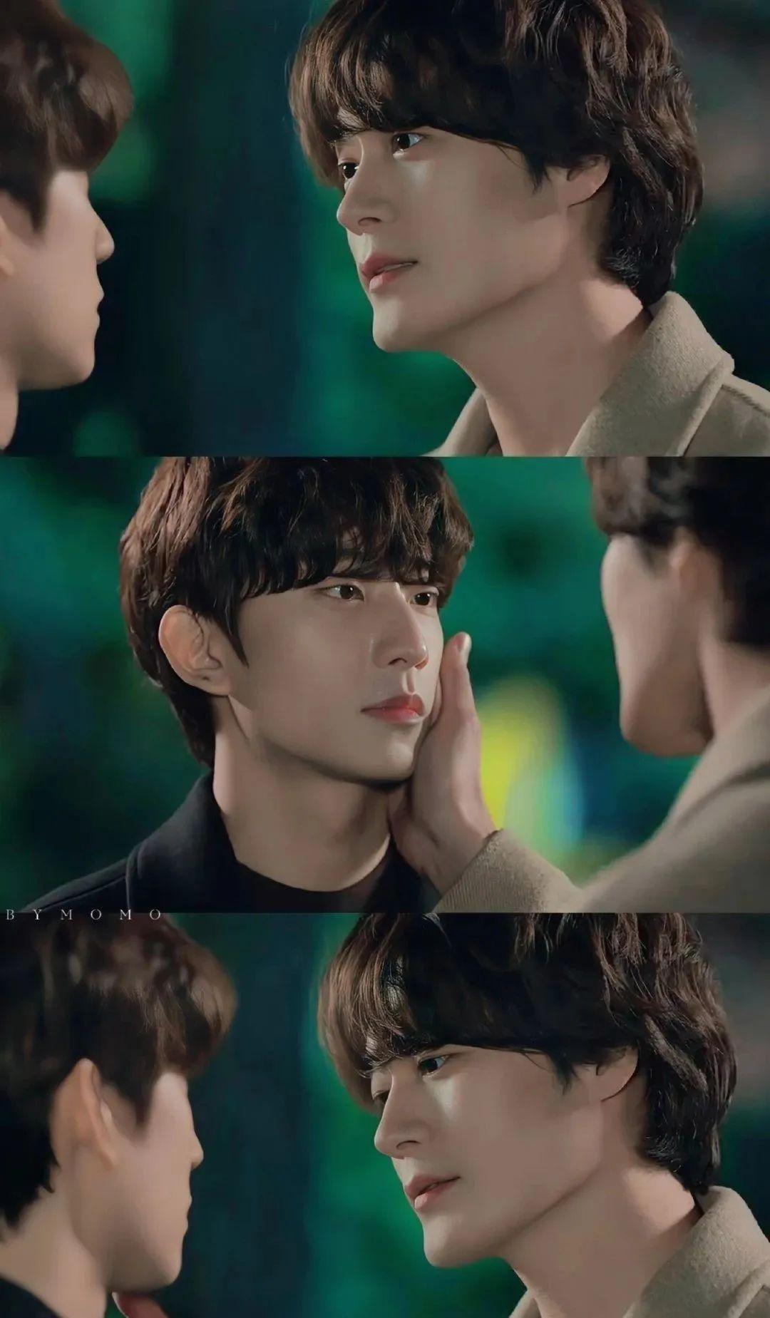 听到这句台词时我简直不敢相信自己的眼睛和耳朵,事后证明这确实是剧本对泰俊的改编。面对爱或不爱的永恒矛盾,有人强抢豪夺,有人机关算尽,有人自暴自弃,是多么温柔的灵魂才会提出这样的“要求”啊?漫画中泰俊在元英回去后喃喃自语的“新策略”,也被车瑞元站在深夜依然涌动的海边欲言又止的一往情深取代了,背景中的明月、礁石、白浪、红塔成为片头的第一个镜头,足以证明制作团队有多看重这一幕。至此,剧作实现了对漫画腹黑霸总的彻底改造,上位者尹泰俊把自己摆在与下位者池元英相同的位置,放弃使用任何形式的权力迫使对方在爱情中就范。在欲望面前,恪守双人舞的规则,你一步,我一步,不勉强,“你觉得”和“我觉得”同等重要,尊重双方的主体性,同时允许双方都有脆弱的权力。车瑞元演活了这种对亲密关系中权力动态的重新想象,久违地让我看到耽改这个越来越像B级片的亚类型的希望。后面他还贡献了许多仙品级的表演,比如谎言揭穿时在极力克制后情绪爆发流下的一滴泪,以及听闻元英不想见他后陷入震惊抽动的嘴角等以往大量新人下海无法想象的动情场面——上一次在耽剧中看到如此精湛的表演恰巧也是有大量正剧经验的演员下海。