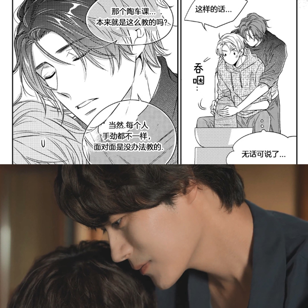 陶艺课手把手教学成为名场面同样颇为值得品味。当元英紧张得问泰俊一定要环抱着手把手教他时,漫画中泰俊摆出陶艺家的架子(权威/权力)回答“当然”,而剧中的泰俊稍显迟疑,随后轻声回答是,在元英看不见的耳后悄悄露出了一抹笑意,那绝不是得意的偷笑,而是接收到对方同样坐立不安的讯号后满心欢喜快溢出的笑。