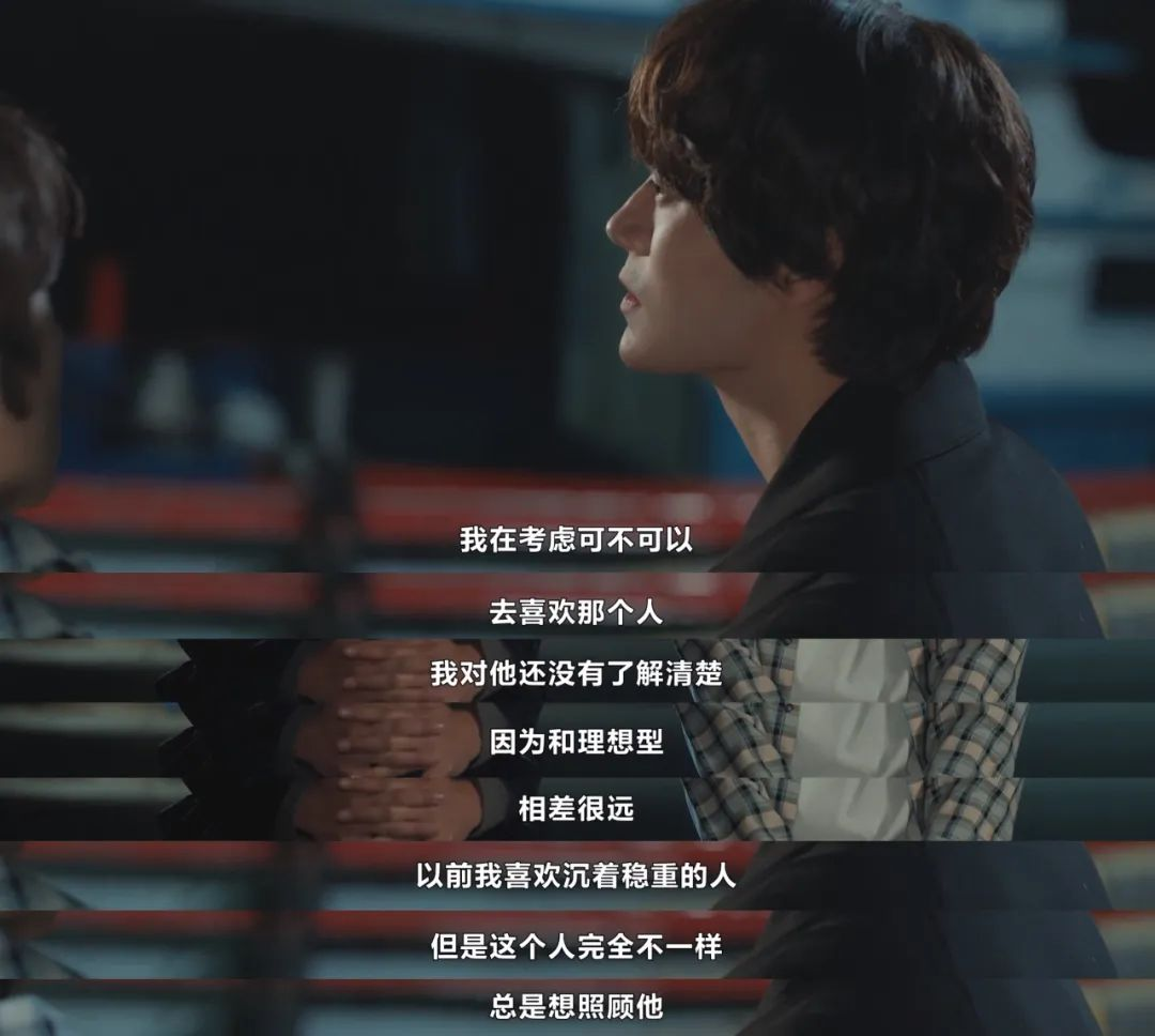 把酒谈心后泰俊冲到书店门口“赶走”浩泰、单独与元英谈心、在即将告白前戛然而止的戏,成为让我垂直入坑的戏剧张力顶点。这是一场不管怎么夸奖都不为过的好戏,雨夜的海岸公路,彼此的心意就像湿滑的路面一样难以抓牢,只有沉默的大海上轮船的点点灯光照亮他陪他默默走过的心路。两人的情感先后经历双方都选择逃避的非理性处理后(元英搬家结束同居/泰俊失意冷言回击),走到了一触即发的临界点,闹别扭和说反话再也无法解决问题,泰俊终于发出了第一记直球,追问让元英困扰的情愫到底是什么。可惜被工作电话打断的不止是元英的告白,更是对最初别有目的接近泰俊的懊悔,旋即改口试图将之前的情感矛盾大事化小、小事化了。泰俊察觉出他的退缩,也陷入失落,可是并不知晓真实原因的泰俊无法立即在这曲看似你进我退、实则共同进退的双人舞中更进一步,而是退其次用更婉转的表述让元英也有台阶下。说出口的是“你可以继续依靠我”,没说出口的是“不管你对我抱有何种情感,我不再追问了”。如果元英还没有准备好与他在命运的红线当中相遇,他便也退了一步,退到不会让元英困惑、烦恼的位置。他对元英最后的话竟然是“既然已经互相道歉了,明天让我们笑着跟彼此打招呼吧”。