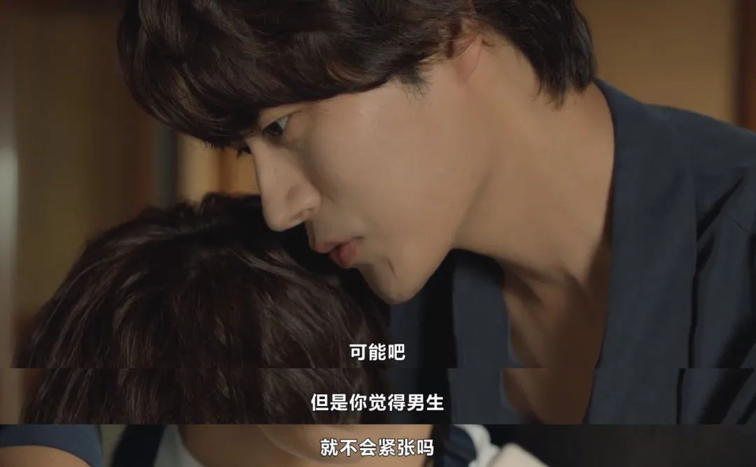 当然这不并代表漫画全无可取之处,元英接着用《人鬼情未了》相似的女男亲密戏当玩笑想掩盖紧张和尴尬时,泰俊的回复成为非故宇宙最经典的台词。在暗含表白的话语里,前一秒的欢欣还未尝够,与对方同样的紧张就自己跑出来了。“你以为(环抱着的)是男的我就不紧张了吗?”配上车瑞元轻缓且慢一拍的语气,停顿的那一拍之间,心跳已经透露他们共同的秘密。无需霸总不讲理的豪言,他以示弱的台词,将爱情刚刚绽放时最美的模样演绎得淋漓尽致。剧情尽力刻画出爱情中泰俊与元英的平等地位,虽然我鼓起勇气握住你的手——你紧张,我也紧张;你不安,我也不安。那些容易被当成拿捏和算计的权力动态,在车瑞元克制又温柔的表演中,以弱胜强。更不要说在亲密过后,泰俊反而略带害羞地跑出去自嘲幼稚,内心的百转千回尽在忍不住回头隔窗凝望心上人的一霎,刚刚紧张时抿紧的嘴唇松开了,想到那人就微微上扬的嘴角,又胆怯得及时克制住了,那个未成型的微笑宛如蒙娜丽莎般迷人。耽美文本规范里也有类似的刻板印象标签,比如少女攻,但车瑞元的泰俊远比一个或几个标签丰满得多,他无法被简单的条条框框定义。但他也不复杂,他就是人,人的每一面,七情六欲,由不得挑选,他都有,会心动,会害怕,时而会心一笑,时而泪流满面,彻底摒弃了异性恋性别范式要求的“男儿有泪不轻弹”或“女人是水做的”。