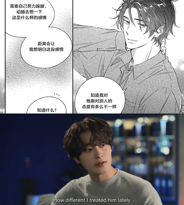 在第一个戏剧高潮前夕泰俊与东熙把酒谈心是个很好的例子,剧本大幅度钝化了泰俊的侵略性,他不仅不像漫画里那样游刃有余、将对元英的迂回策略盘出后腹黑得让东熙咋舌,甚至是有点可怜的——东熙质问他对元英突然冷漠的原因,他回答的第一句是“你提醒过我说他只是个过客”。泰俊对这段关系也是自我怀疑的、忐忑不安的,漫画里的“诡计多端”在车瑞元极其内敛的演绎下,谈及元英一副垂目若有所思的泰俊更像是患得患失的恋爱中人,而不是费尽心机故意忽冷忽热考验对方。