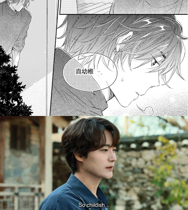 兴许是演员也给角色带来了一些剧本难以具象化的鲜活特质,在剧本选择完全贴合漫画的部分情节中,车瑞元塑造的泰俊就与漫画家最初描绘的泰俊产生了割裂。不仅是够不够腹黑、霸总的问题,比如第3集给元英擦药膏的戏,我看第一遍看时不明白为什么泰俊要故意弄痛元英的带状疱疹伤口,还偷笑?这与之前醒酒后的早晨泰俊打断元英肢体接触时极力克制的距离感,以及元英不在场时泰俊才在砖窑前握着元英做的第一件陶器露出淡淡的微笑,完全前后矛盾,或是缺乏过度。补完漫画才发觉抹药是两人之间第一场具有性意味的戏,元英的裸背和疼痛反应让泰俊产生了性唤醒。这本来没什么,可以当作小小的情趣或非恶意的作弄,但在极力去性化的剧版中,这个情节就显得十分突兀。