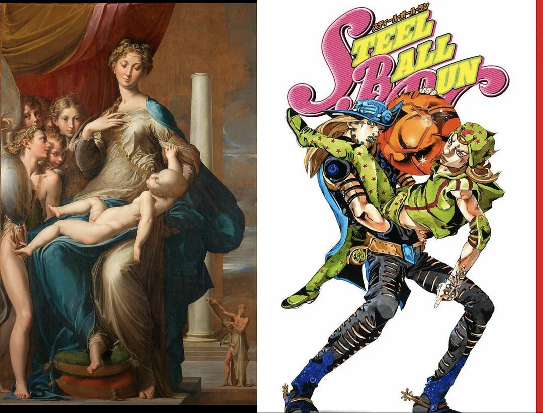 ⚠️ 声明rn本文包含大量姿态考据、艺术史类比与强行碰瓷。rn主要目的是:rn整理《JOJO奇妙冒险》第七部《Steel Ball Run》中,人体构图、视觉母题与西方艺术史之间的潜在关联,并非官方考证。rn若有遗漏或不同理解,欢迎补充。rnrn一、《Steel Ball Run》的美学断层rnrn如果说1–6部JOJO仍然建立在“古典英雄身体”之上,那么SBR从第一话开始,就主动放弃了这种传统。rn在SBR中,我们看到的是坐着的主角和无法保持稳定站姿的身体以及被自然压缩到画面边缘的人