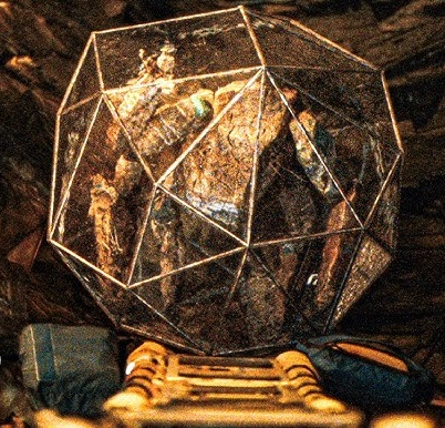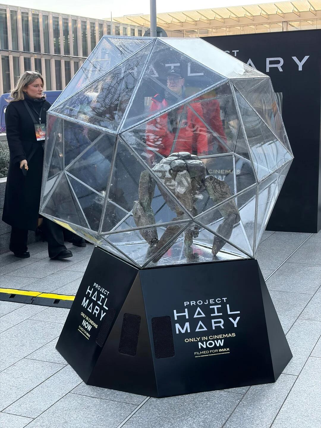 原著中,对接状态下飞船处于失重,Rocky在他的氙岩正十二多面体(由他习惯的正五边形组成)中,有两只“手”各持一块强力磁铁,交替吸附舱壁来移动。在预告片及一些线下纪念品中,多次出现多面体(远多于十二面,也不是由正五边形组成)中的Rocky造型。我当时还奇怪为什么他手中未持磁铁。现在看过电影才知道,按影片中的设定不需要了……