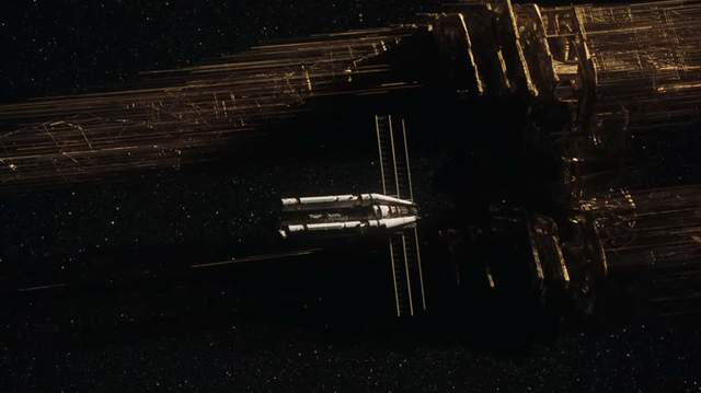 值得注意的是,影版飞船的尖头是朝后的。(飞船旅程的后半段全是推进器指向前进方向,飞船两头确实都有轻度的屏蔽宇宙尘埃的流线型需求。不过,为什么不能两头都尖?)