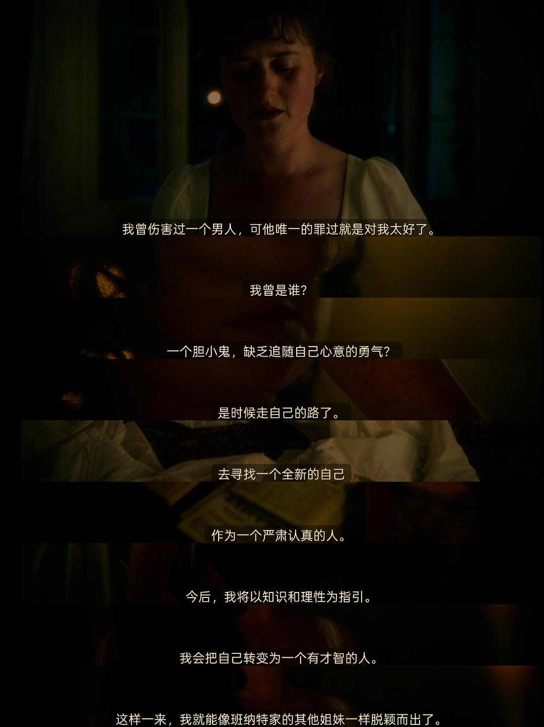 最后的结局就我而言过于浪漫,如若女主真做出了一生不婚的决定,那又会如何?或是,即使走出去了也没能摆脱社会对于一位女子的要求,还是结婚了,那么又会如何?nn仍为当下讨论的话题。nn结尾小小插播一句:没看到丽兹和达西婚后的互动实在遗憾……(上班以后对于原本就是包饺子的故事依旧心存浪漫幻想~)nn希望永远都拥有:出走的决心,与勇气。