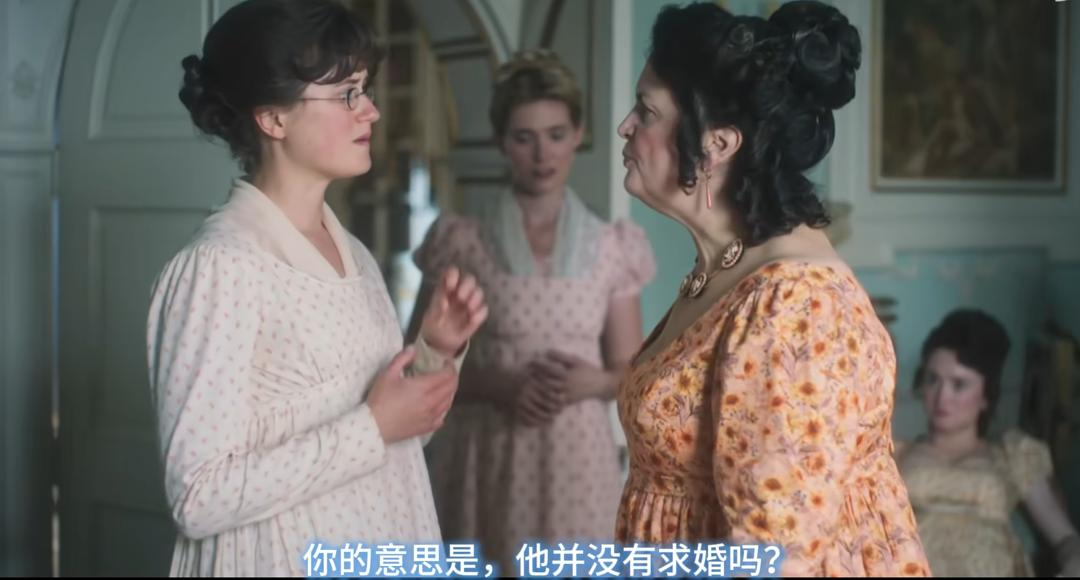 在莱德表达诉求后离开,玛丽出门时,贝内特夫人和玛丽交流。