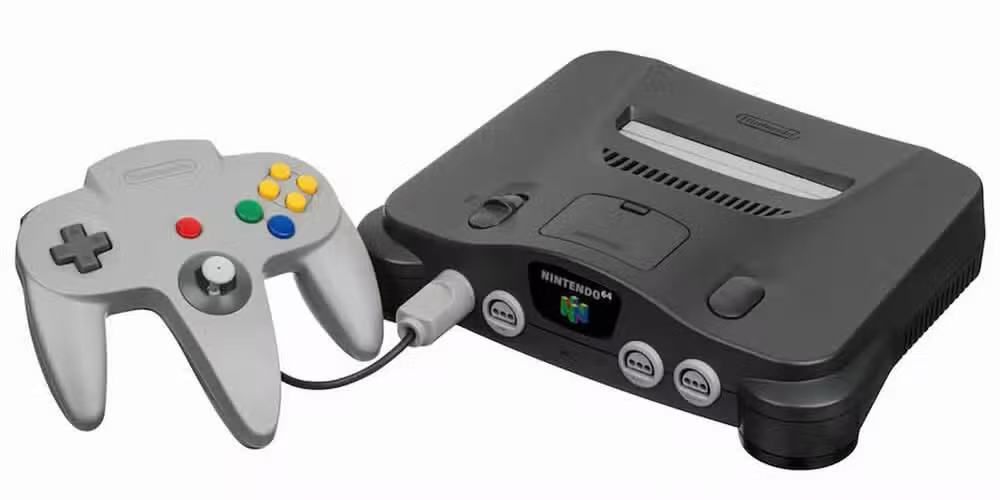 任天堂64游戏机,背景中的一栋建筑物顶部有N64 标志的全息投影。