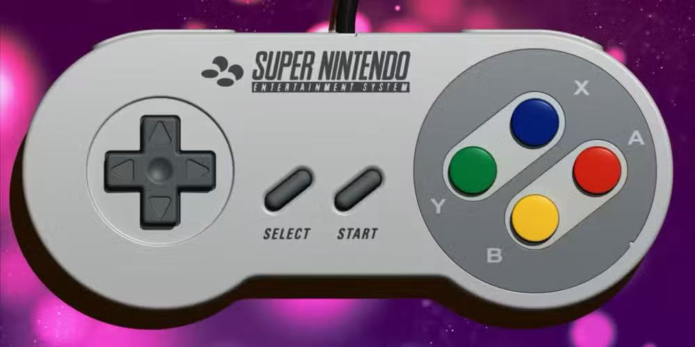 紫色背景上的超级任天堂(SNES)游戏手柄