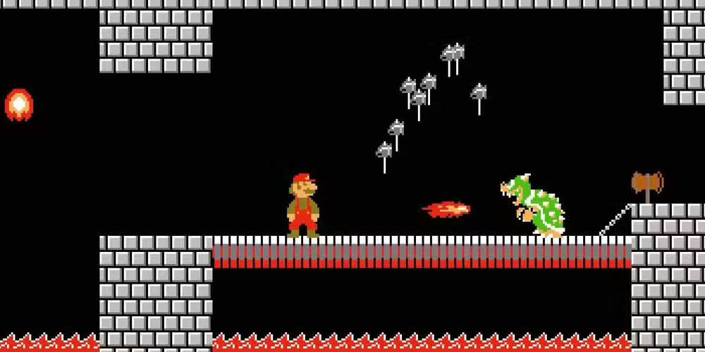 在俯瞰熔岩的桥上与库巴和他的儿子战斗时,马里奥还配备了一把斧头,灵感来自各种超级马里奥游戏中与库巴的经典最终boss战。