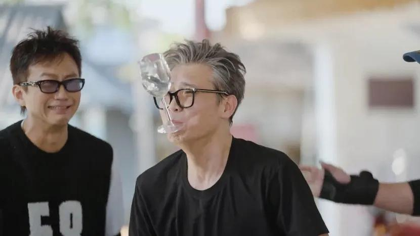 嫌弃马頔是路障的Never叔倒是站起来了,但把滑冰爆改成了踢踏舞,滑是万万不行的,只能跟着音乐节奏左右抬腿。于是在接力传水环节,我们就看到一位五旬老人弯腰弓背跳popping,一位民谣歌手坐在椅子上复健式蠕动,两人越努力越辛酸的样子有种没有功劳也有苦劳的感觉,被其他五哈兄弟毫不留情地嘲笑。
