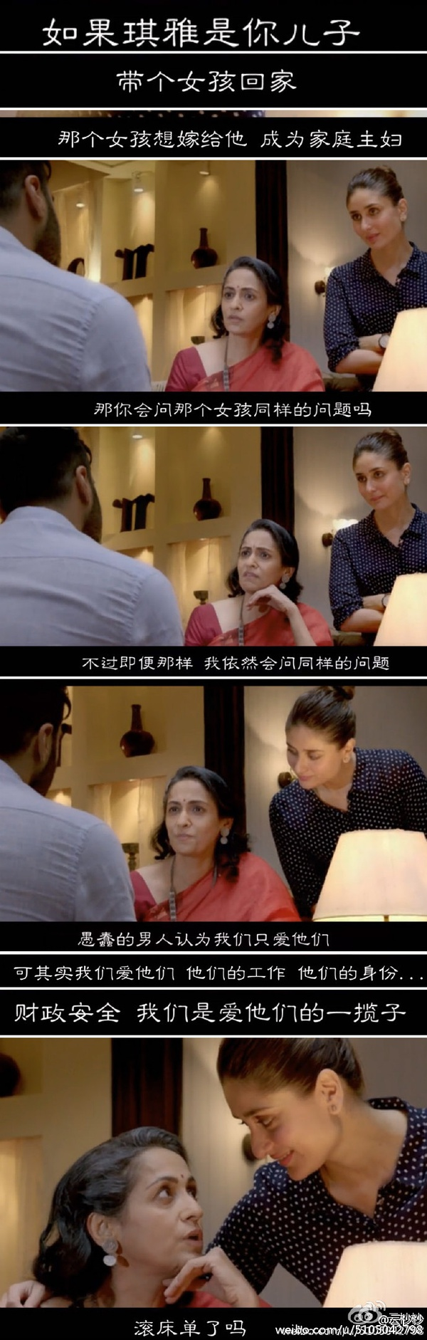 写了很多后面还是删了,我也无法说出太多这方面的理论装逼了,毕竟于平权社会职能问题自己也毫无实践经验的新手而已。但从截图的对话中都能感受到编剧真的对社会中性别和家庭问题做了不少功课,很多时候双方的争执点其实都是各有自己的立足点而不是一好一坏的分明,还有挺多小剧情大家就自己去看吧。演技方面卡琳娜·卡普尔这位大牌演的女主实在太赞,相比三傻时的她我甚至觉得她更年轻了,眼神都满满是戏,虽然有时候有些浮夸但也不会太过分。男主相比女主就有些呆了,时常死鱼眼表情恹恹,不过就是感觉是内心弹幕乱飞的那种人。歌舞很少,基本没跳过,就是有些过场mv,但场景美音乐赞非常养眼。搜了下才发现,这个导演就是之前我说过难得的印度女性主义佳片《印式英语》的导演啊!