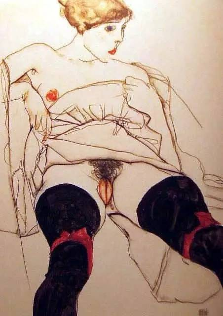 但是席勒在画美丽的女子的时候往往是“手下留情”,不过处理手法同样很席勒。夸张的人物姿势;以及怪异的角度来对画面进行描述;而最重要的一点是,好像这些画都充满了“色情意味”。也正是这点,让席勒的艺术道路上充满了意外和麻烦。这些“下流”的作品不应该被展示出来,有伤风化,人们往往这样说。