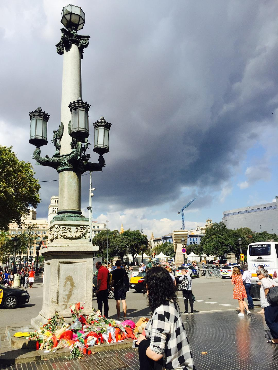 繁华的兰布拉大道正是之前巴塞罗那遭受恐怖袭击的地方(而就在美国当地时间10月1日晚,拉斯维加斯Route 91 Harvest乡村音乐节遭遇枪手扫射的恐怖袭击,至少造成59死515伤……)。路口如今还放置着许多的鲜花和蜡烛,悼念亡者。路上停着警车,走三五步便看到荷枪实弹的警察。