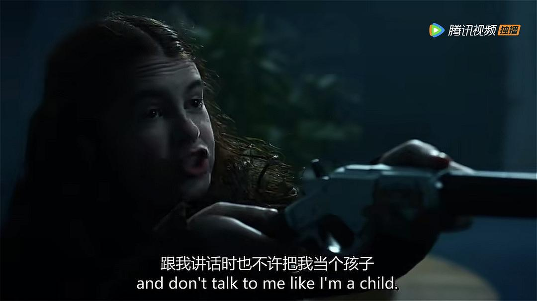 从这个叫杰米的小女孩言行举止来看,她是个聪明早熟的孩子,经历过很多事情。她先抛出一只足球做诱饵吸引狄肯的注意力,接着用一把玩具枪顶住狄肯后背挟持了他,开始提出需要“干爽的衣服,还有吃的,不许让我躲到一边,跟我讲话时也不许把我当个孩子,你得发誓要保护我”,狄肯都一一答应下来,最后杰米要求和狄肯拉勾来保证,毕竟是个孩子,整个过程脱离不了稚气可爱的一面。