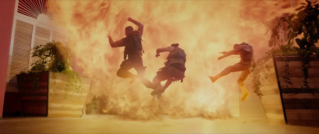 黑帮暴徒驾车冲到门口,艾迪Eddie等人将点燃的沙发从楼顶窗口丢下,砸在车上,将车点燃……